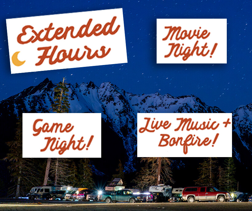 And for those with overnight camping reservations in the White Salmon lot April 6, 7 and/or 8 will get to enjoy dinner in the White Salmon lodge, plus either games night, movie night, or live music and s'mores over a bonfire for just $15 per person. There’s always a good time to be had for families and friends camping overnight … moon and starlight on the mountains, the after-hours experience in the wilderness … but this spring we are bringing some extra fun to the experience!