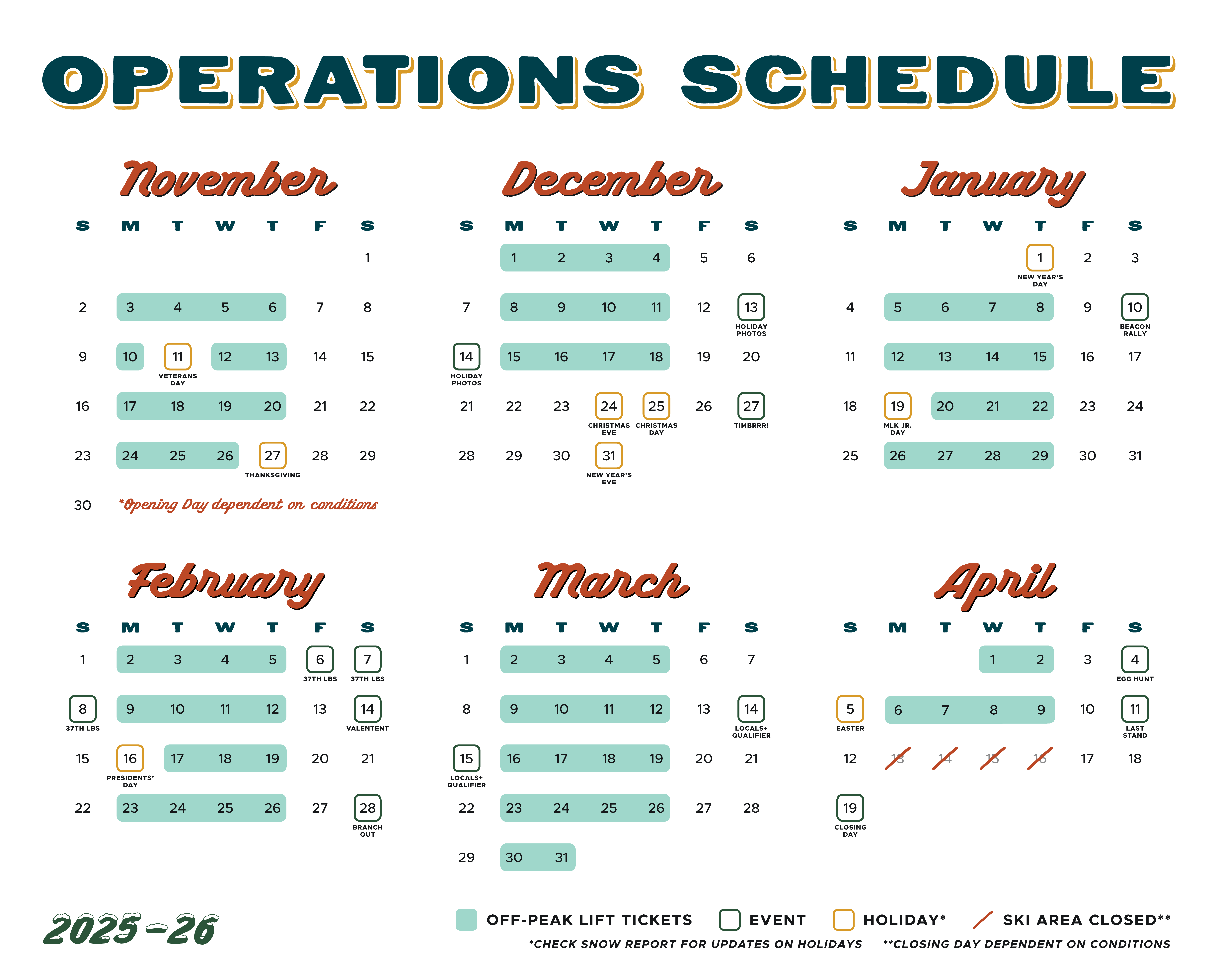 Chair lifts run daily from 9:00 am to 3:30 pm and our lodge facilities are open from approximately 8:00 am to 4:15 pm*. For more details on our daily operations, base areas, and available services, including those that may require you to plan ahead, check the daily Snow Report.