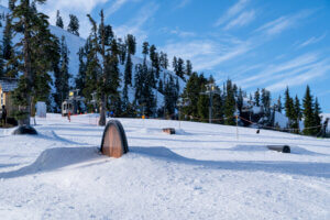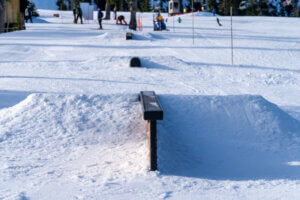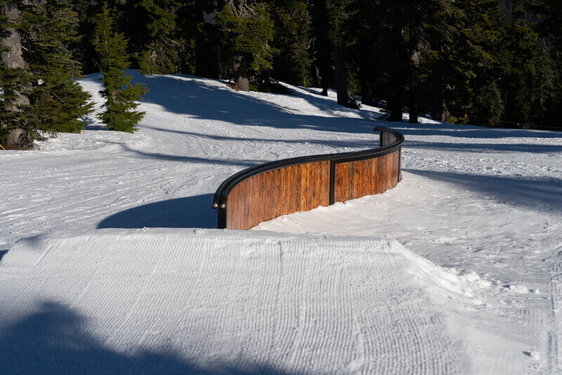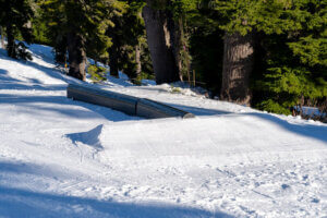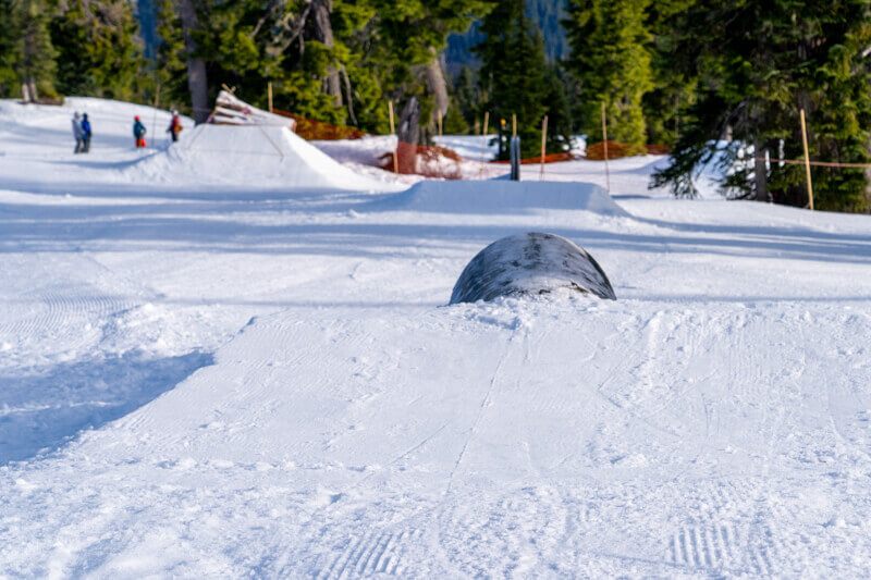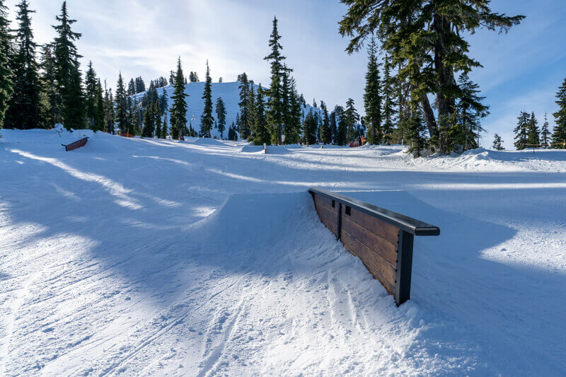 The Feature Zone is located near the top of Chair ¾ in between Big Creek (beginner) and Sneaky Pete (intermediate) runs.